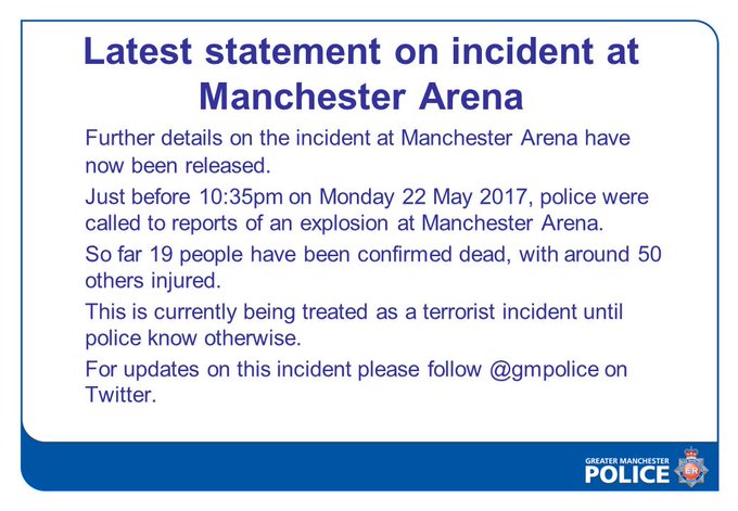 Los responsables del pabellón afirmaron en que los hechos ocurrieron fuera del recinto. "Podemos confirmar que hubo un incidente cuando la gente salía del espectáculo de Ariana Grande la pasada noche. El incidente se produjo fuera del recinto, en una zona pública".